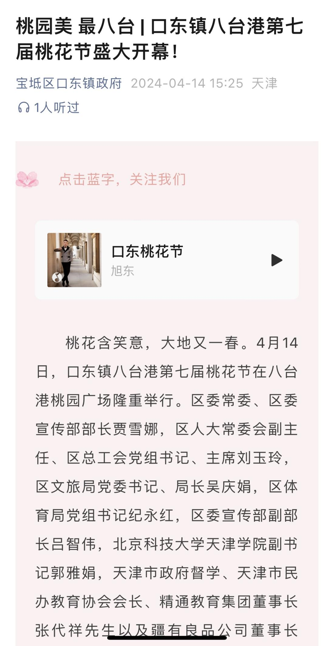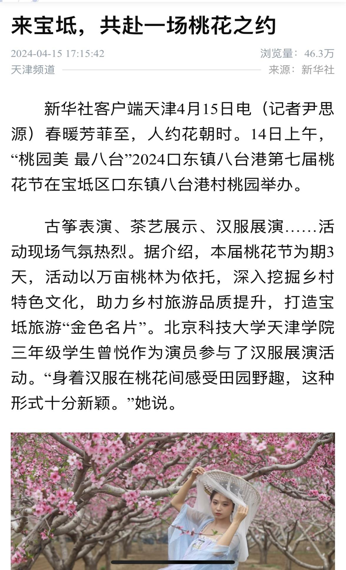 共赴桃花之约,尽享春日盛景。本次活动,88038威尼斯团委开启了一场青年学生与乡村振兴的“双向奔赴”,不仅得到了主办方的高度评价和认可,也受到了人民网、新华社、网易新闻、宝坻融媒等多家媒体的宣传报道。
