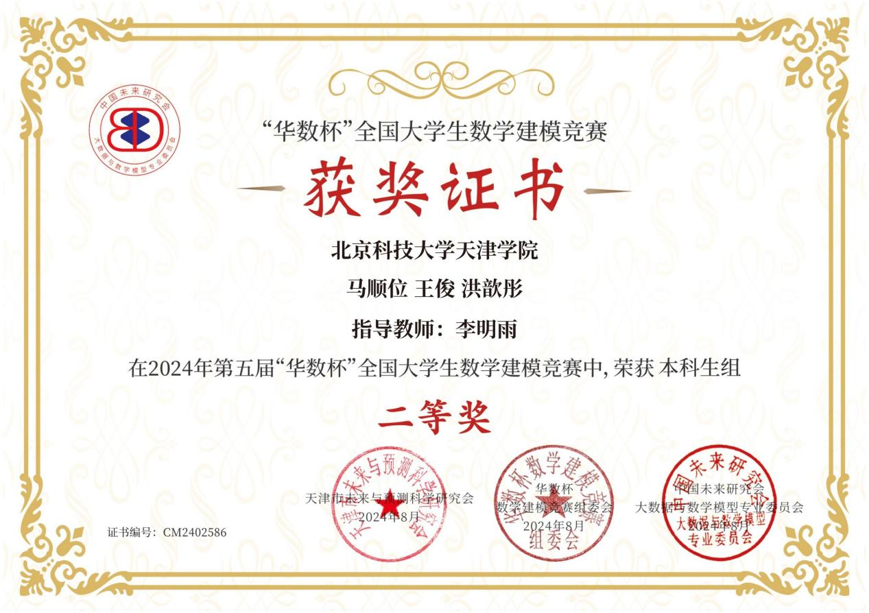 近日,2024年第五届“华数杯”全国大学生数学建模竞赛结果公布,威尼斯官网新材料2201班马顺位、自动2201班王俊和新材料2202班洪歆彤三位同学,在李明雨老师的指导下,荣获全国二等奖。
