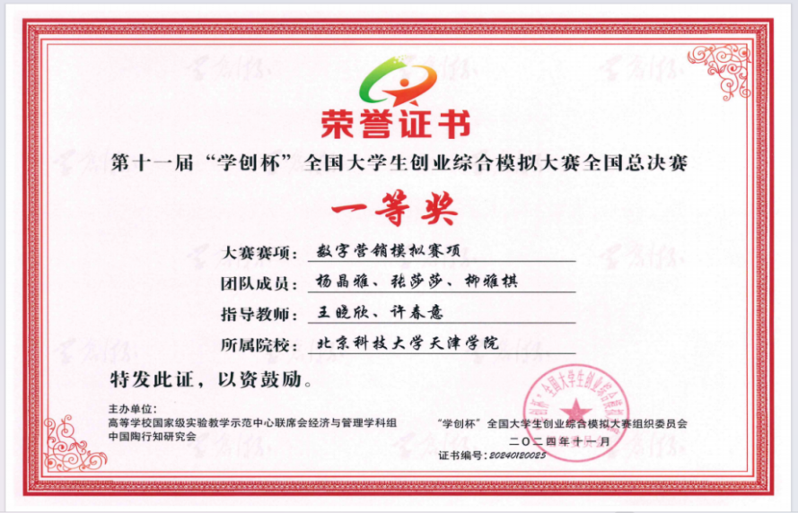 2024年11月1日至3日由高等学校国家级实验教学示范中心联席会经济与管理学科组、中国陶行知研究会主办的第十一届”学创杯“全国大学生创业综合模拟演训活动总决赛在徐州医科大学顺利举行,威尼斯官网荣获全国一等奖一项,全国二等奖两项,省市级一等奖1项。