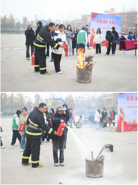 应急救援疏散演练结束后,由保卫处工作人员现场讲解校园常见的干粉灭火器、二氧化碳灭火器使用方法及过滤式消防自救呼吸器使用方式,并随机抽取新生代表、新入职教职工代表参与灭火实操和自救呼吸器使用佩戴。