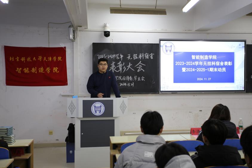 为表彰先进典型、树立学习标杆,激发广大学生的学习热情,智能制造学院分团委、学生会于11月27日下午在9教104举办2023-2024学年无挂科宿舍表彰大会暨2024-2025-1期末动员,智能制造学院院长朱超甫、党总支书记陈月、副院长班岚、2023-2024级辅导员出席,200余名学生干部参加,活动由分团委书记李雲啸主持。