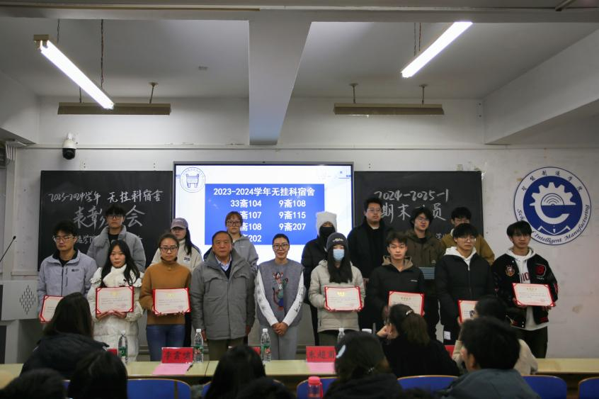 朱超甫院长与陈月书记共同为2023-2024学年无挂科宿舍颁发荣誉证书及纪念品。