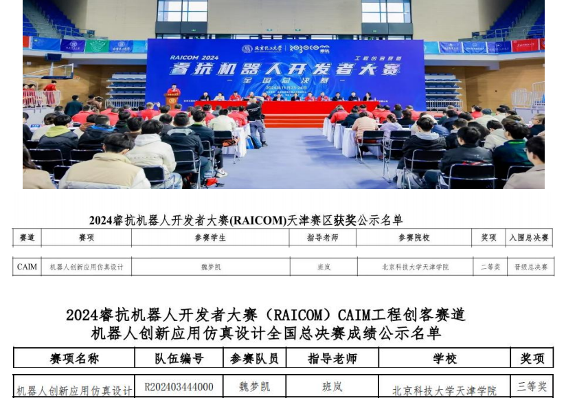 近日,由工业和信息化部人才交流中心主办的2024睿抗机器人开发者大赛(RAICOM)全国总决赛落下帷幕,我校智能制造学院机械工程(机器人应用)专业学生魏梦凯在班岚老师的指导下,于“机器人创新应用仿真设计”赛项中荣获天津市赛区二等奖和全国总决赛三等奖。