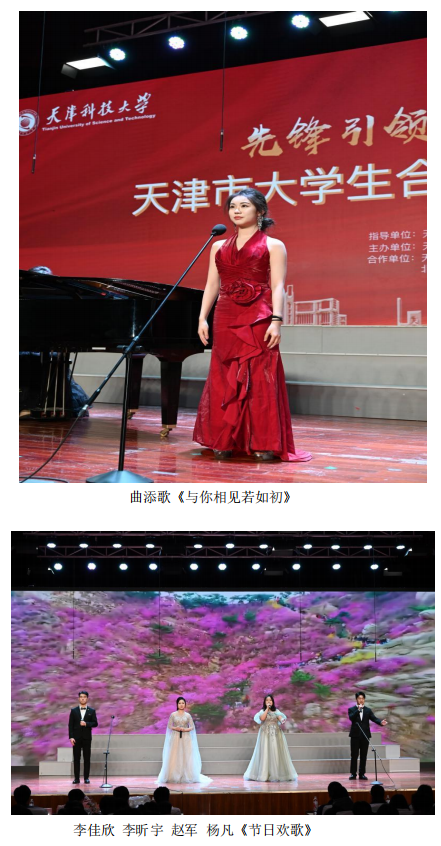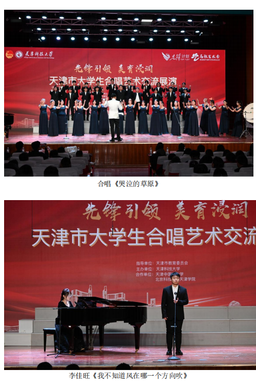 当天,天津科技大学滨海校区千人礼堂内弥漫着浓郁的艺术气息,在我校学生艺术团合唱团指导教师,崔帅老师的带领下,我校学生合唱团演唱了在2024年天津市学校文艺展演中荣获一等奖第一名的作品《哭泣的草原》,合唱团成员李佳欣、李昕宇、赵军、杨凡带来的四重唱《节日欢歌》,李佳旺、曲添歌演唱《我不知道风在哪一个方向吹》、《与你相见若如初》等脍炙人口的声乐作品,将音乐会一次次推向高潮,团员们用歌声展现了我校实施美育浸润的高效成果。
