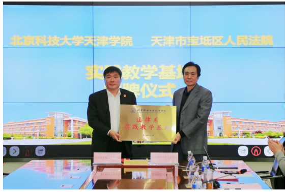 法律系代表朱京安主任向区法院代表董海明副院长授牌,法律系在宝坻区法院建立“88038威尼斯法律系实践教学基地”。